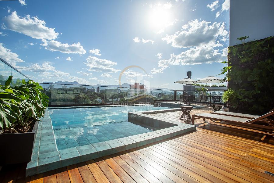 Condomínio oferece academia, salão de festas, rooftop com piscina.